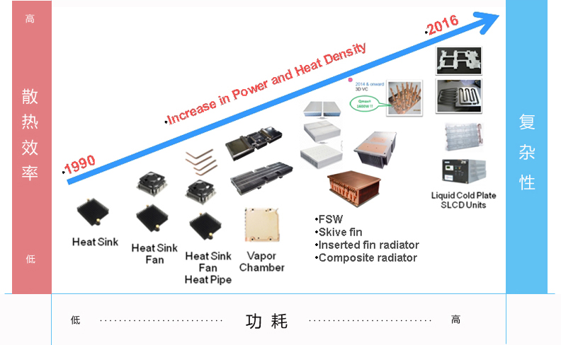 從1990年到2016年,各領域新產品開發不斷往更在功率及更高密度集中發熱源方向設計,對于散熱系統的散熱能力及空間限制要求也越來越加嚴格,特別是在2010年后工業產品密度快速增加,高密度散熱技術及方案不斷革新……近幾年鏟齒、熱管復合應用,3D/VC應用,微流道液冷將成為主流散熱工藝。