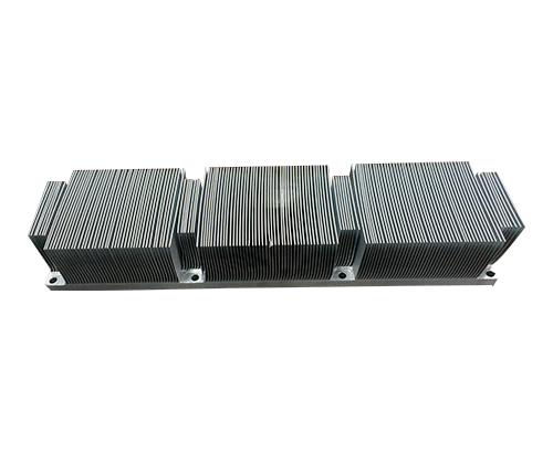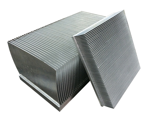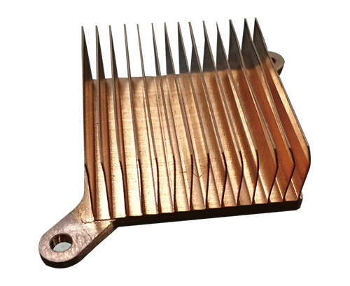 Skived fin heat sinks: When passing through the machine, slabs are skived in a specific angle so as to form and bend the fins. With the repetitive cutting, it forms consistent gaps and structures and can be used for cooling high-power devices under air-cooled conditions. This process can enhance 8~15% of the cooling capacity as compared to the stitched fin process.