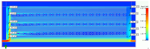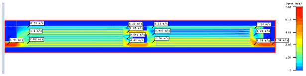 (3)圖示為水流分布圖,下蓋板3.0mm 厚,上蓋板4.0mm 厚,中間fin 3.0mm
