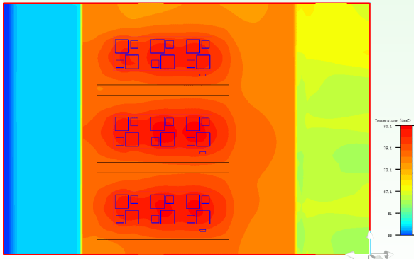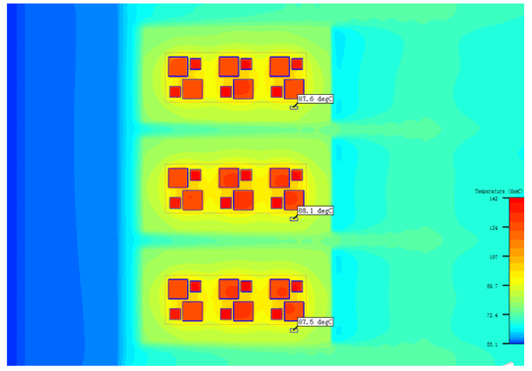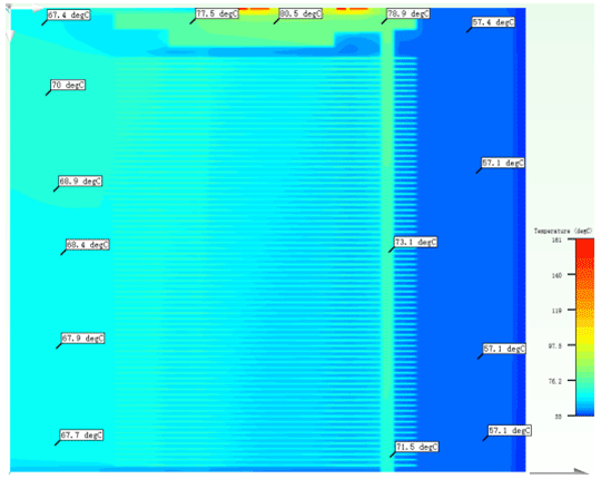 (散熱器實際進風溫度~57.1?C,散熱器底板最高溫度85.1?C,理論分析溫升28?C)